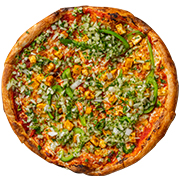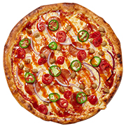 Inferno Sauce, Shredded Mozzarella, Pepperoni, Spicy Sausage, Red Onion, Tomatoes, Fresh Jalepeno Dressed With Sriracha Honey