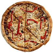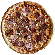 Red Sauce, Shredded Mozzarella, Pepperoni, Ham , Bacon Crumble, Ground Beef