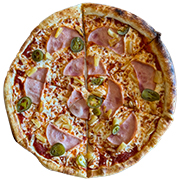 Red Sauce, Shredded Mozzarella, Ham, Roasted Pineapple, Jalapeno