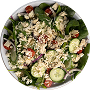 Spinach, Chicken, Feta Cheese, Tomatoes, Red Onion, Cucumber, Green Peppers, Lemon Herb Dressing