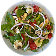 Spinach, Artichokes, Tomatoes, Green Peppers, Mushrooms, Red Onion, Fresh Basil, Raspberry Vinaigrette